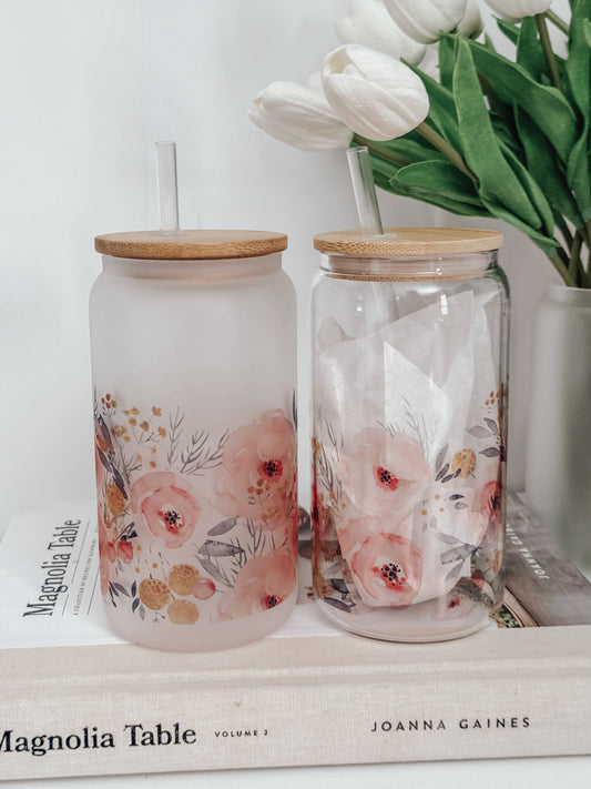 Watercolor Roses 16oz Glass Cup with Bamboo Lid: Clear