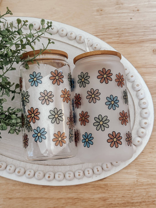 Minimalist Daisy 16oz Glass Cup with Bamboo Lid: Frosted