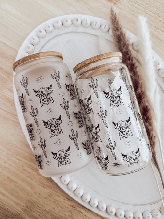 Highland Cow 16oz Glass Cup with Bamboo Lid: Clear
